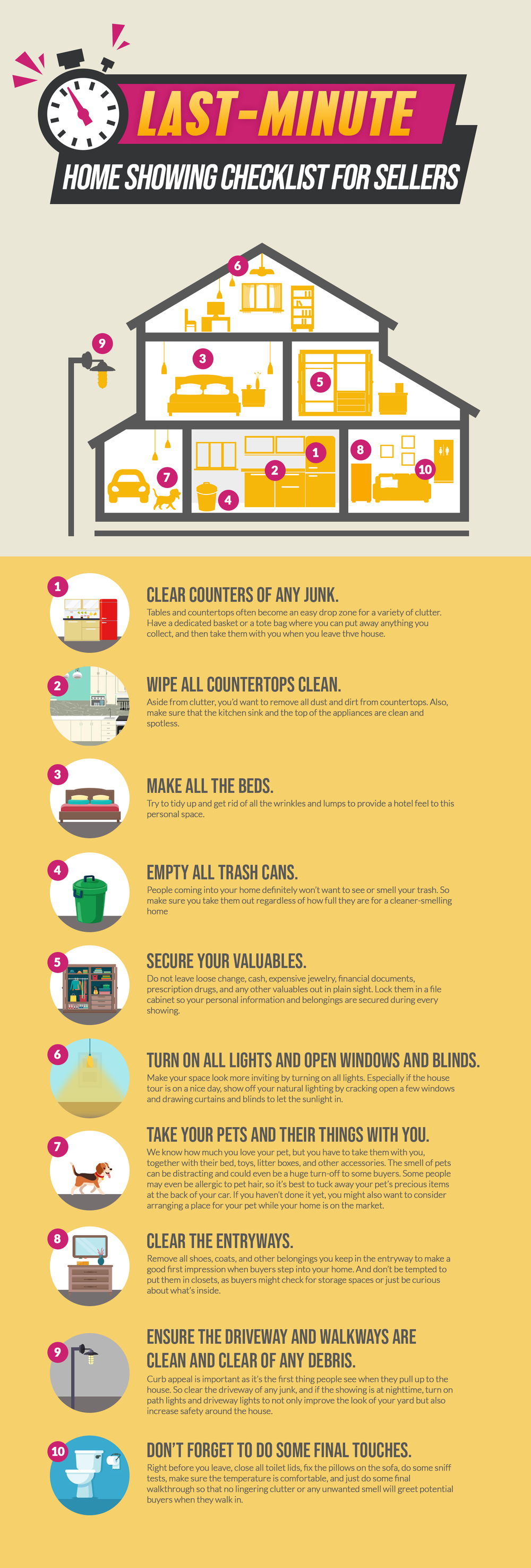 Now, all you need is a simple checklist just in case you get a call from your agent that a buyer wants to see your house in an hour… or less. Here are a couple of tasks you can do to further make a good impression and lessen the stress of every single home showing.